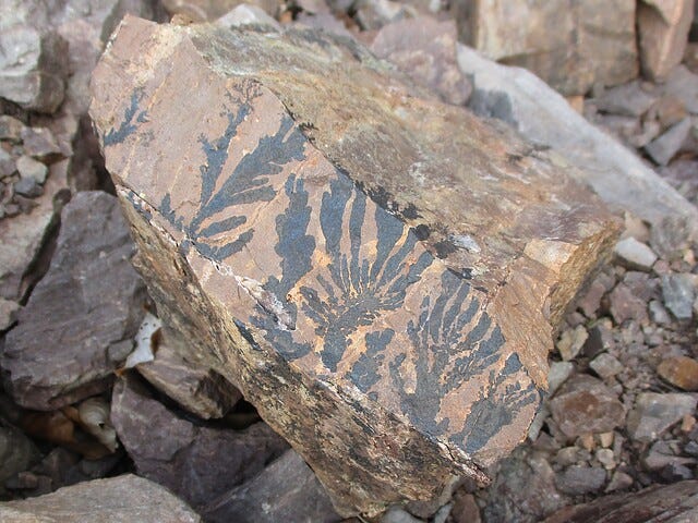 Dendritic mineral patterns are nature’s perfect impersonators, often mistaken for ancient plant fossils, even by seasoned geologists, because their delicate, tree-like forms so closely resemble ferns, moss, and branches. Sometimes called “nature’s ink drawings,” these striking designs look hand-painted onto stone, especially where dark manganese oxides stand out against pale rock surfaces. In Alaska, dendritic inclusions are prized in agates, cherts, and cabochons, with some specimens displaying multicolored effects when iron, copper, or nickel oxides mix together. Scientifically, dendrites are natural fractals, self-repeating patterns that mirror themselves at every scale, much like snowflakes, river deltas, and lightning bolts. Historically, they’ve carried symbolic weight: in Europe’s Middle Ages, they were known as “writing stones” or “moss agates” and were believed to contain hidden messages, divine imprints, or ancient plant spirits. Alaska’s varied geology makes them especially fascinating here, as dendritic patterns can appear in agates, chert nodules, fossil-rich beds, and even glacial deposits where mineral-laden water once seeped through fractures, leaving behind these intricate, lifelike imprints.