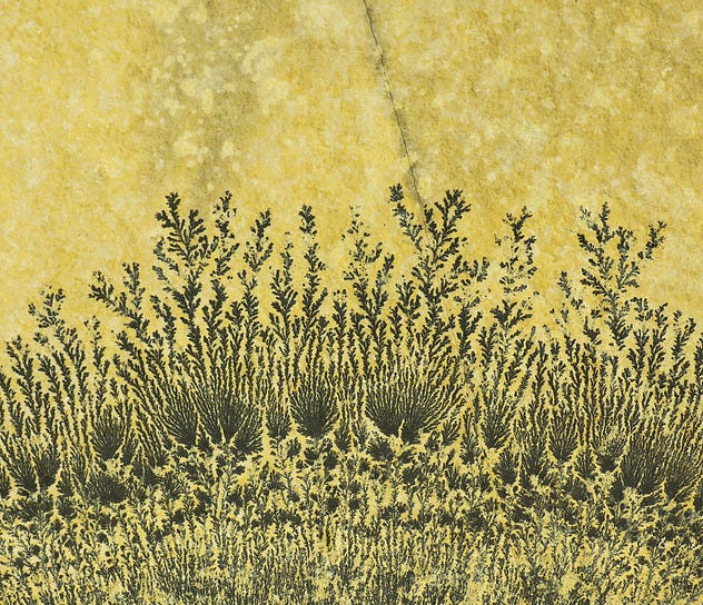 The tree-like shapes are not random; they are governed by principles of diffusion-limited growth. When mineral-laden water spreads through porous rock or along a bedding surface, it deposits oxides in the direction of least resistance. The precipitation begins at one point, then continues branching as new surfaces are exposed, resulting in a self-similar fractal, patterns that repeat at multiple scales, just like the branching of trees or river systems. This gives dendrites an uncanny organic resemblance, despite having no biological origin. In volcanic regions of Alaska, especially where ancient lava flows meet sedimentary basins, dendritic manganese oxides can decorate the surfaces of sandstones and mudstones, producing dramatic contrasts of dark black against pale rock.